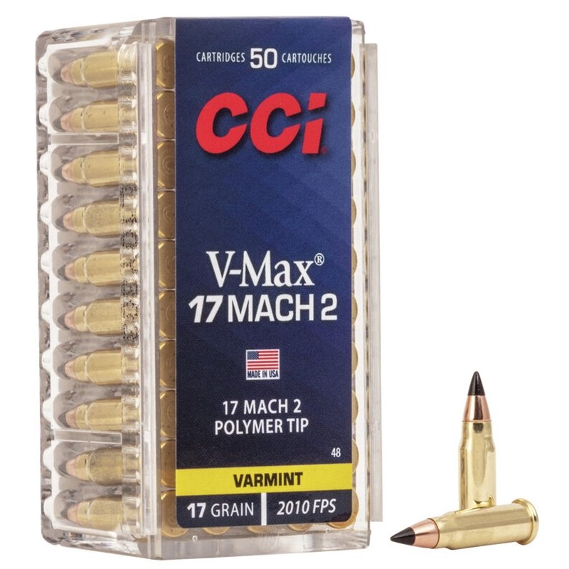 CCI 17 Hornady Mach 2 Ammo 17 Grain Hornady V-Max ammo review offers the following information; Delivering an explosive and accurate performance over and over again with incredibly reliable ammunition is what CCI Ammunition is known for among hunters and target shooters alike! For over 50 years shooters have counted on CCI for all of their rimfire ammunition needs, and CCI has always delivered. This CCI 17 HM2 features a 17 grain polymer tipped V-Max bullet which allows it to be 60% faster than a 22 Long Rifle round. The CCI 17 HM2 polymer tipped V-Max bullet expands similar to big game bullets. The V-Max bullet mushrooms like a big game bullet instead of fragmenting like a varmint bullet. This gives the shooter minimal meat and hide damage yet still provides excellent accuracy and powerful impact. This Hornady V-Max ammo has a muzzle velocity of 2010 feet per second and a muzzle energy of 152 foot pounds. The 17 HM2 ammunition is not a variation of the 17 HMR and is not interchangeable with it. CCI designed this 17 HMR ammo to be new production, non-corrosive and feature Sure-fire CCI priming. CCI 17 HMR ammunition is packaged in a box of 50 rounds or a case of 2000 rounds for your convenience and is the perfect choice for an accurate and explosive long range shot!