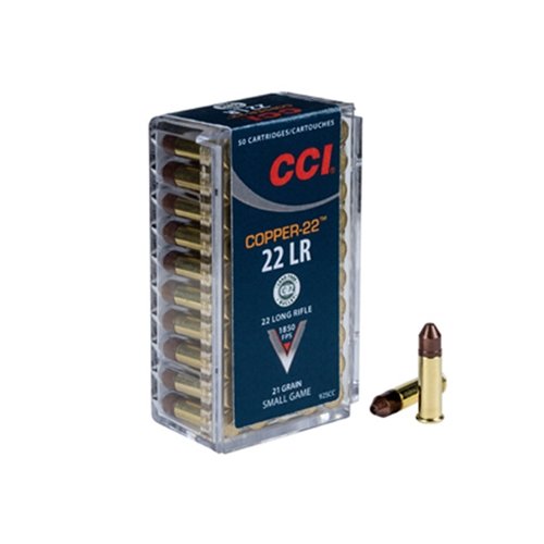 CCI 22 Long Rifle Ammo 21 Grain Compressed Copper Polymer ammo review offers the following information; CCI Ammunition is known for among hunters and target shooters alike for delivering an explosive and accurate performance over and over again with incredibly reliable ammunition! For over 50 years shooters have counted on CCI for all of their rimfire ammunition needs, and CCI has always delivered. CCI 22 Long Rifle ammo features a 21 grain copper plated hollow point bullet ammo. CCI ammo is perfect for target shooting or personal protection. This specific 22 Long Rifle is ideal for hunting, plinking, and target shooting. This copper hollow point ammo has a muzzle velocity of 1850 feet per second and a muzzle energy of 160 foot pounds. CCI designed this 22 Long Rifle ammo to be lead free, feature boxer priming, and to be made up of the company’s Copper-22 mix of copper and polymer particles to offer exceptional shooting capabilities. CCI 22 Long Rifle ammunition is packaged in a box of 50 rounds or a case of 2000 rounds for your convenience and is the perfect choice for an accurate and explosive shot!