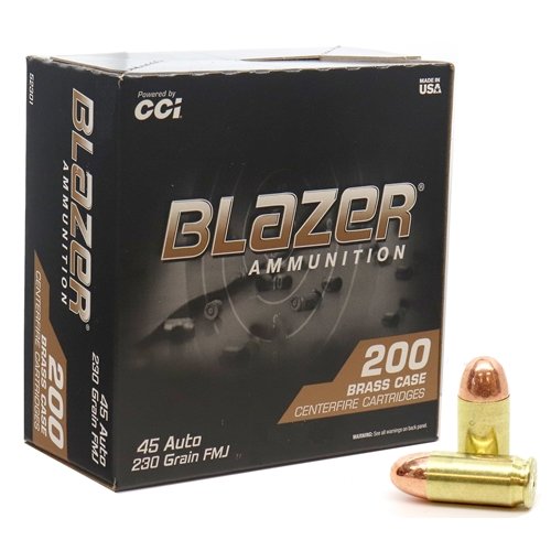 CCI Blazer Brass 45 ACP Auto Ammo 230 Grain Full Metal Jacket Value Pack ammo review offers the following information; 45 Blazer Brass ammo made by CCI is your best choice for bulk 45 ACP Auto target shooing ammunition. CCI Blazer Brass 45 ACP Auto ammo for sale online at cheap discount prices with free shipping available on bulk 45 ammo orders only from TargetSportsUSA.com. Newly manufactured .45 ammo here in the United States, that features a full metal jacket copper plated bullet, brass casing, non-corrosive primers. Made by the same company that manufactures Speer Lawman 45 ammo as well as the Federal American Eagle 45 Auto ammunition using same great quality components and manufacturing equipment. If you choose to reload your 45 ammo, CCI Blazer Brass offers virgin brass that can be reloaded up to 5 times due to its high quality and low mixtures of other materials. Trusted CCI has gone above and beyond with the Blazer Brass line! With the same high standards that shooters have come to know and love with standard Blazer ammo, the Blazer Brass line gives the benefit of a brass casing making it reloadable. 45 ACP Auto ammo by CCI are an excellent choice for target practice or just plinking around at the range. CCI Blazer Brass 45 ACP Auto is a new production, non-corrosive, re-loadable ammunition with boxer primers and brass casing.