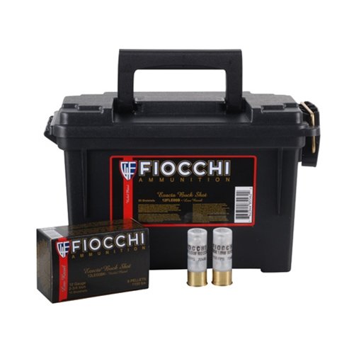 Fiocchi 12 Gauge 2 3/4″ 00 Buckshot 9 Pellets High Velocity 80 Rounds in Ammo Can ammo review offers the following information; Fiocchi 12 Gauge ammo for sale 80 rounds in a plastic ammo can at a great value with free shipping included on bulk ammo only at our online store TargetSportsUSA.com. Target Sports USA carries the entire line of Fiocchi slugs for sale in clouding this High Velocity 1oz. slugs. Fiocchi 12 Gauge High Velocity Slugs offer a Muzzle Velocity of 1325 feet per second. Fiocchi made these rifled slugs with the ability to apply a wad attached to the base of the slug for in-flight constancy and on-target precision. The full bore strategy distributes the energy on target that shooters demand. Fiocchi slugs were designed to be the perfect choice for home defense, law enforcement, hunting and competition, the only round a marksmen will need for any occasion.While most of Fiocchi ammunition is loaded at their plant in Ozark, Missouri, Fiocchi is also importing ammunition and reloading components from their plant in Italy because of the high demand the industry has been experiencing. Fiocchi Shooting Dynamics training line of handgun ammunition is loaded to exacting and stringent factory specifications. All Fiocchi products are loaded to either C.I.P. or SAAMI specifications. Fiocchi High Velocity is non-corrosive, new production ammunition in boxer primer.