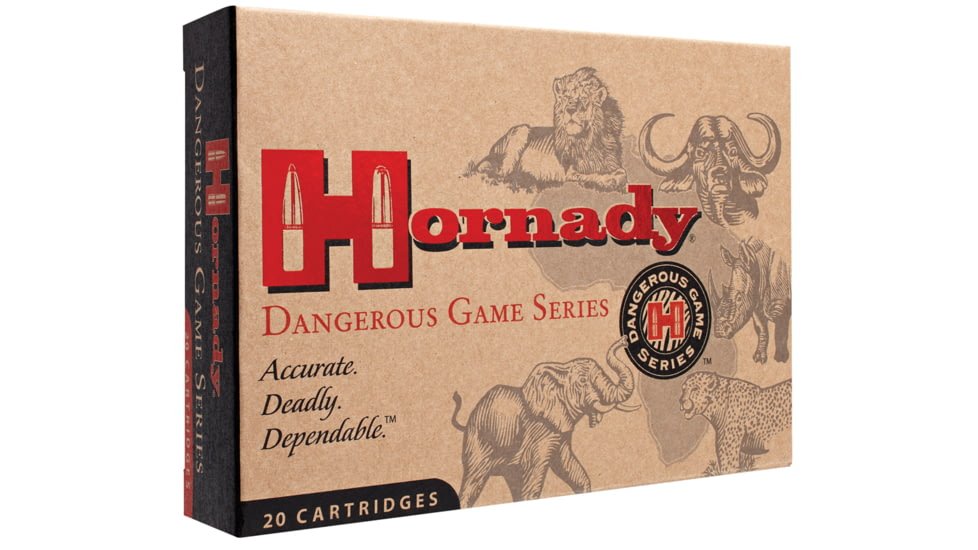 Hornady 82682 Dangerous Game 500-416 Nitro Express 400 gr Dangerous Game Solid – Hornady Dangerous Game Series ammunition is designed specially for a large game and safari hunting. The Dangerous Game Solid bullets are made with a hard lead/antimony alloy cone, surrounded by a copper clad steel jacket. The bullets feature a flat meplat for straighter penetration and create more energy transfer than a simple round profile bullet.