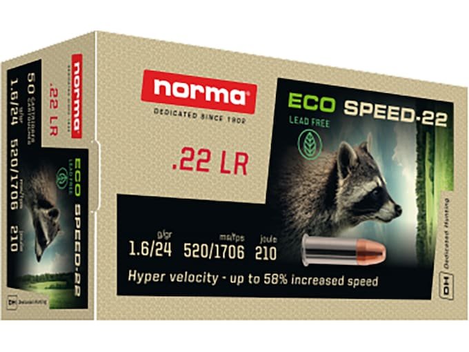 For many years, Norma ammunition has built an outstanding reputation as premium ammunition for hunters in Europe and Africa. Today, Norma USA also offers premium rimfire cartridges for the small game hunter. This ammunition is loaded with premium hunting bullets for maximum terminal performance. ECO Speed-22, with a muzzle velocity exceeding all others on the market, is 100% lead-free, including the primer, making it quite unique on the market. If you do a lot of semi-auto shooting, all those harmful lead particles from traditional ammunition get into the air you’re inhaling and can harm your internal organs. With Eco-Speed you can focus on shooting instead of worrying about the smoky air. This ammunition is new production, non-corrosive, in nickel-plated cases.