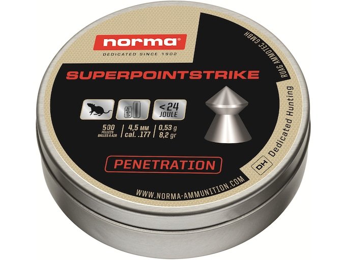 The Norma Superpoint Srike Air Gun Pellets 177 Caliber 8.2 Grain Pointed Tin features superior knock-down power and excellent penetration with unmatched versatility. Versatile in nature and precise by design, the Norma airgun pellet series has the product for every airgun user. Understanding the new trends and fields of application together with cutting-edge technologies, Norma has created a lineup to fit a broad range of purposes for outstanding results in every field. These are the perfect hunting and plinking pellet for airguns below 24J. The Norma Superpoint Strike are ideal for plinking or hunting where deeper penetration is your primary goal.