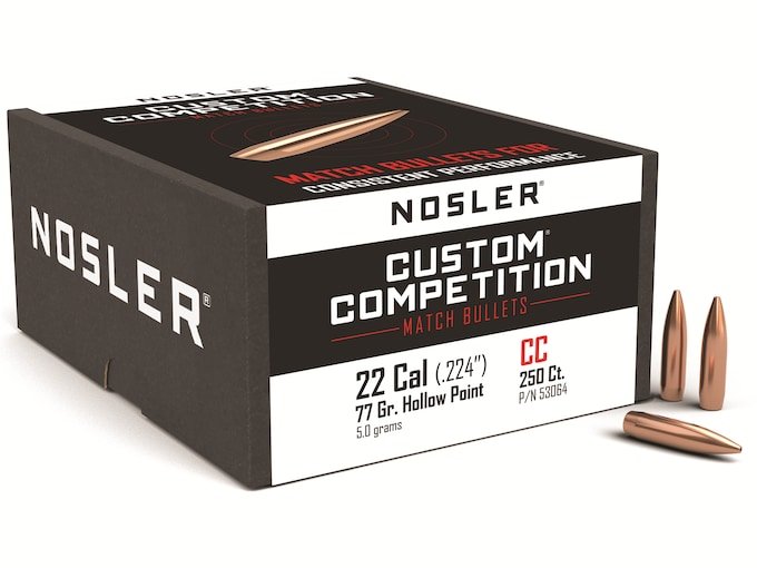 Nosler Custom Competition Bullets 22 Caliber (224 Diameter) 77 Grain Hollow Point Boat Tail with Cannelure Box of 250