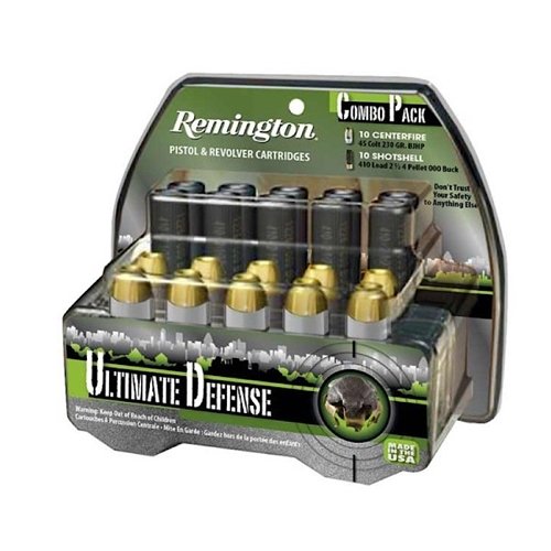 Remington Ultimate Home Defense 45 Long Colt/ 410 Gauge Ammo #000 Buck Combo Pack ammo review offers the following information; Remington is an industry leader in both firearms and ammunition manufacturing. Remington is well respected in the industry for producing high quality ammunition made to exacting standards to meet any shooters needs! Remington uses the best components along with the newest technology and manufacturing techniques to create some of the best ammunition available on the market. This Remington Ultimate Home Defense Combo pack is ideal for the shooter using one of the popular 45 Long Colt/ .410 revolvers. Remington has created a packaged deal on ammunition that contains 20 rounds, 10 rounds of 230 grain Jacketed Hollow Point bullets and 10 shells of 410 Gauge 4 Pellet 000 Buckshot 2 1/2″ to make one of the best defense cartridges made. Loaded with Remington’s high performance Jacketed Hollow Point bullet, these rounds provide massive expansion and deep penetration for ultimate stopping power. Premium nickel plated brass cases resist corrosion and cycle dependably through extended storage. Designed to be reliable and predictable through all common barriers, this ammunition is a popular choice for a lot of law enforcement agencies. Using Remington’s Driving Band Technology to deliver the best accuracy. Remington ammunition can be used for defense, duty, hunting, competition, and recreational applications. Excelling at high quality and reliability Remington ammunition is one of the very best available! Remington Ultimate Home Defense Combo pack Jacketed Hollow Point bullets are non-corrosive, new production ammunition in boxer primer and nickel plated brass cases.