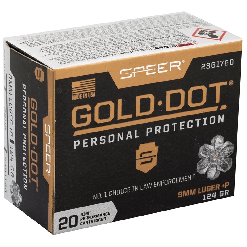 Speer Gold Dot 9mm Luger Ammo P 124 Grain Jacketed Hollow Point review offers the following information; Speer Gold Dot ammunition continues dominating the law enforcement community! Gold Dot high performance handgun ammunition has earned the trust of thousands of law enforcement officers across America and around the world. Its proven reliability for tough jobs has made it the top duty ammunition on the market today. Private Citizens too, can count on Gold Dot’s superb performance, accuracy, and reliability with their Personal Protection line; whether consumers need the best for concealed carry, home protection, or target shooting, Gold Dot delivers, shot after shot. This Speer Gold Dot 9mm Luger ammunition is loaded with a 124 grain Jacketed Hollow Point bullet. Speer bonds the jacket to the core one molecule at a time. This process eliminates core-jacket separation, which is the leading cause of handgun bullet failures and often inherent in the design of conventional bullets. The hollow point cavity is formed in two stages. The first establishes how far the bullet can expand; the second controls the rate of expansion. This patented two-step cavity formation gives Speer engineer’s incredible control in the design process. Each bullet caliber and weight is tuned for optimum expansion and penetration. The bullet is finished to provide a smooth profile for reliable feeding in semi-auto handguns.