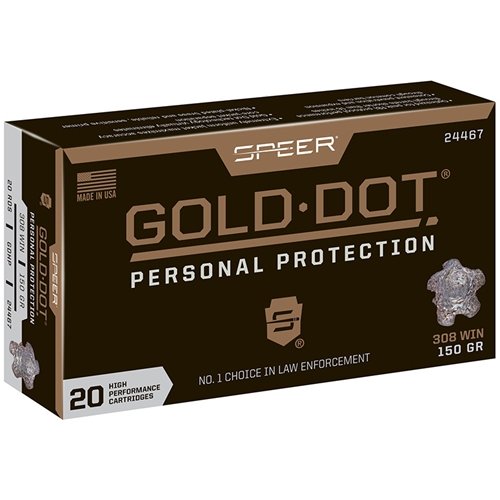 Speer Gold Dot Personal Protection 308 Winchester Ammo 150 Grain Soft Point review offers the following information; 308 Winchester ammo made by Speer is reloadable, features nickel plated brass cases and Boxer primers and this is a non-corrosive round. The Gold Dot ammunition goes through a process of joining the jacket and core one molecule at a time, thanks to this Speer eradicates the potential for the leading cause of bullet failure—jacket/core separation. This process will so guarantee extraordinary weight retention through barriers as strong as auto-glass. In addition to its remarkable strength, Gold Dot rifle ammunition asserts remarkable accuracy. With exact tolerances and unparalleled bullet uniformity of jacket thickness, Gold Dot rifle loads have an outstanding accuracy.