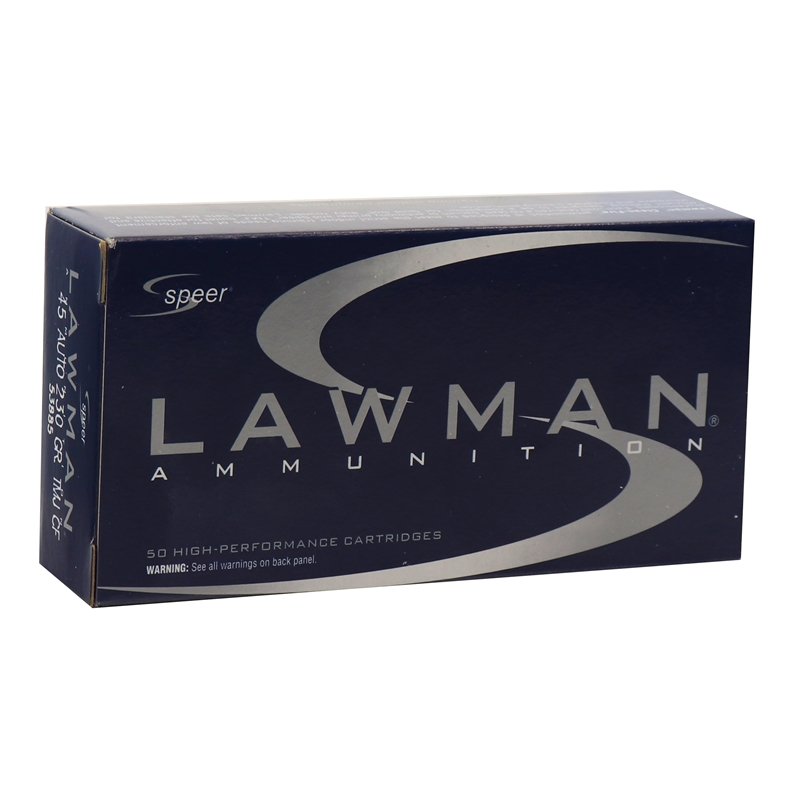 Speer Lawman Cleanfire 45 ACP Auto Ammo 230 Grain Total Metal Jacket ammo review offers the following information; Speer Lawman ammo is priced attractively and it is considered to be general purpose ammunition, a perfect combination of highly quality ammunition with a favorable price. The 53885 by Speer Lawman was designed for shooters of all rating, from novice to professional all the way to competition shooters. Speer Lawman Cleanfire is the optimum pick for most indoor ranges. The ammunition was developed with distinctive features like a total metal jacket and clean burning powder and primers meaning there are virtually no toxic airborne metals at the firing line. Speer Lawman ammo features re-loadable brass casings, boxer primer and CCI Primers. Lawman ammunition is offered in Speer TMJ bullets or standard FMJ bullets, the ideal choice for plinking or target practice ammuntition. Many of the Lawman loads contain similar velocities and bullet weights to Gold Dot line in order to make your shooting experience as realistic as possible. Throughout the United States, many shooters including Police Departments use Speer Lawman ammunition in the line of duty.